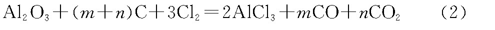 氧化鋁法是以氧化鋁、氯氣及碳三者為原料共同反應(yīng)制取無(wú)水三氯化鋁。國(guó)外研究者20世紀(jì)60年代后期曾對(duì)氧化鋁法制無(wú)水三氯化鋁的反應(yīng)機(jī)理進(jìn)行了研究, 他們認(rèn)為氧化鋁法制無(wú)水三氯化鋁的反應(yīng)式為: