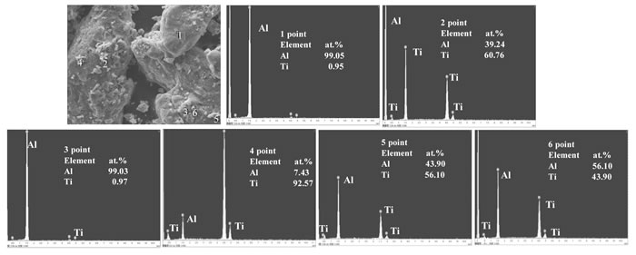 如圖8所示, 電解產(chǎn)品鈦鋁合金分布不均勻。在EDS圖中可以看出, 1、3點具有大顆粒形貌的是金屬鋁, 附著在大顆粒上的小顆粒2、4、5、6, EDS結果顯示成分為鈦鋁合金。由此推斷:恒壓電解過程中, 金屬鋁率先析出在金屬鉬陰極表面, 由于熔鹽電解過程溫度范圍是660~750℃, 所以金屬鋁以液態(tài)金屬的形式存在, 從而包裹在鉬電極表面形成新的陰極, 再與金屬鈦合金化在表面形成金屬鈦小顆粒。部分合金化的鈦鋁被液態(tài)的金屬鋁包裹, 形成圖中所顯示的大顆粒1、3。綜上所述恒壓電解可以得到鈦鋁合金產(chǎn)物, 但合金中存在鋁、鈦相, 需對陰極產(chǎn)物純化處理。