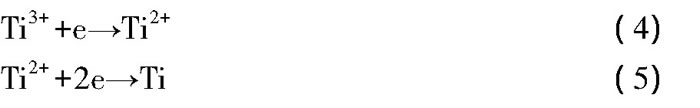 如圖3所示, 在三氯化鋁) 熔鹽體系中, 信號A對應于堿金屬Na的析出, 反向掃描過程, 沒有對應堿金屬Na的溶解信號, 因為750℃金屬Na為液體狀態(tài), 在陰極沉積后就滴落在熔鹽中, 為使反應充分進行, 750℃恒溫1 h, 在恒溫過程中發(fā)生陰極沉積低落熔鹽現(xiàn)象, 所以圖中沒有出現(xiàn)金屬Na的溶解峰。圖3中可看到兩對信號峰B/B'、C/C', 參照Ti離子的還原電位, 對應于Ti (Ⅲ) 離子的兩步法還原過程。根據(jù)B/B'與C/C'的外形可知, 屬于可溶-可溶體系, 即電流先緩慢增加達到峰值后又緩慢減少。Ti (Ⅲ) 、Ti (Ⅱ) 的反應過程如式 (4) 所示。Ti (Ⅱ) 、Ti反應過程屬于可溶-不可溶體系, 如式 (5) 所示。圖中沒有顯示尖銳的沉積峰, 由于鈦與鈦低價態(tài)氯化物的歧化反應造成。