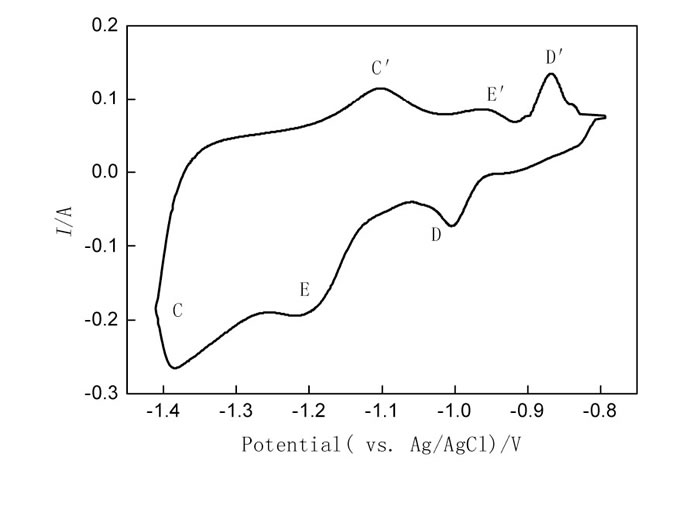 圖4 在Mo電極 (S=0.56 cm) 上, Na Cl-KCl-三氧化二鈦 (1.45%) -三氯化鋁 (6.0%) 熔鹽體系得到的循環(huán)伏安曲線, 溫度:750℃, 掃速:0.2 V/s Fig.4 CV (cyclic voltammetry) curve obtained on molybdenum electrode (0.56 cm) for 三氯化鋁 (6.0%) -三氧化二鈦 (1.45%) in the Na Cl-KCl eutectic at 750℃, sweep rate:0.2 V/s