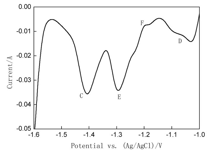 圖5所示, 750℃時, 在熔鹽體系中, 添加過量三氯化鋁, 以20 Hz的信號頻率, 金屬鉬作為工作電極, 進行方波伏安測試。曲線中-1.4V的陰極電流信號C對應于金屬鈦的沉積, 與上述循環(huán)伏安結果相符。在圖中-1.04、-1.3、-1.15 V的3個信號峰與循環(huán)伏安結果相符。C、E、D三個尖銳峰形狀與固相生成峰形狀相似, 與鈦、鋁、鈦鋁合金標準電位具有微弱的偏差。在-1.15 V處所出現(xiàn)的小峰F, 與鈦鋁合金在鉬電極上欠電位沉積有關。據(jù)文獻報道[13-15], Ti (Ⅱ) 離子還原為金屬Ti的電位比Al (Ⅲ) 離子在熔鹽中的還原電位負。在含有Al (Ⅲ) 離子的熔鹽中, Ti (Ⅱ) 的沉積電位要正于Al (Ⅲ) 離子的沉積電位, 這是由于欠電位沉積 (UPD) 引起。