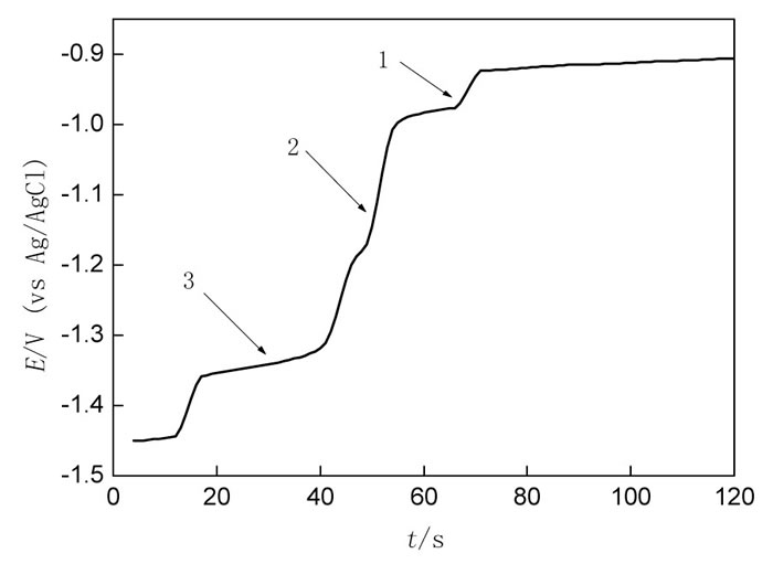開路計時電位法可以用于研究電沉積合金的過程。原理是:通過恒電位電解, 在工作電極表面形成合金層, 記錄電極電位隨時間的變化數(shù)值, 據(jù)此繪制成曲線, 其中曲線平臺代表兩相共存狀態(tài)[16-17]。