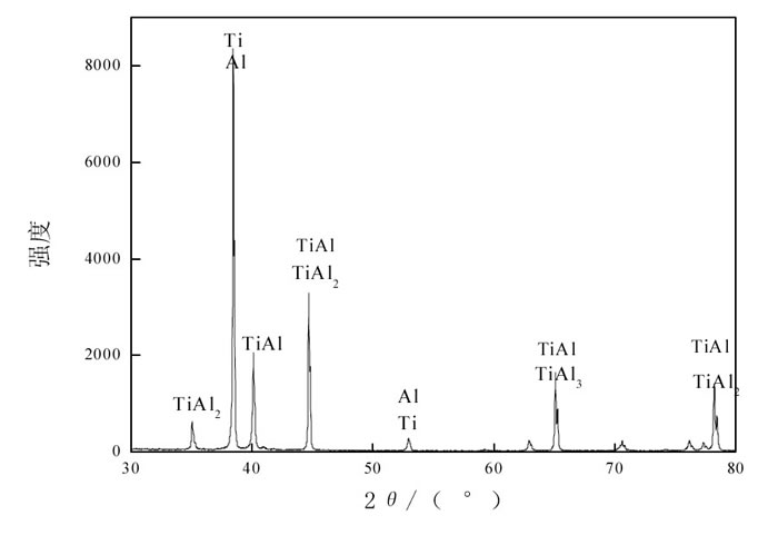 電解鈦試驗過程中, 電解產(chǎn)品鈦粉收集困難, 因為陰極產(chǎn)品容易脫落在熔鹽中而導致電極表面附著量較少。對應于鈦鋁合金熔鹽電解過程也存在相同的問題。XRD圖譜顯示, 電解產(chǎn)物非純相鈦鋁合金還有金屬鈦、金屬鋁相, 高溫電解過程不可控因素較多, 所以對電解產(chǎn)物成分控制仍需進行進一步深入研究。